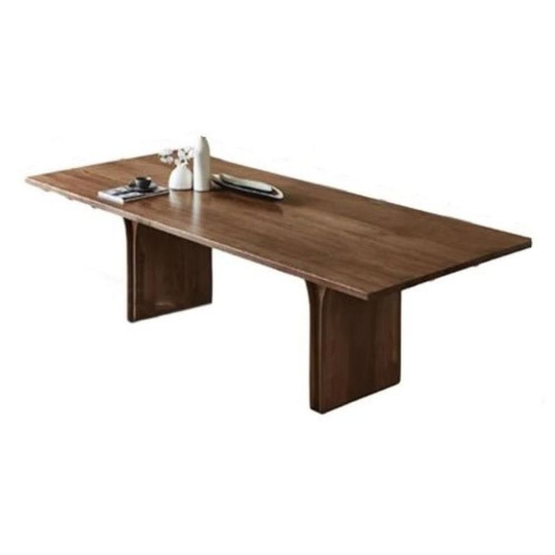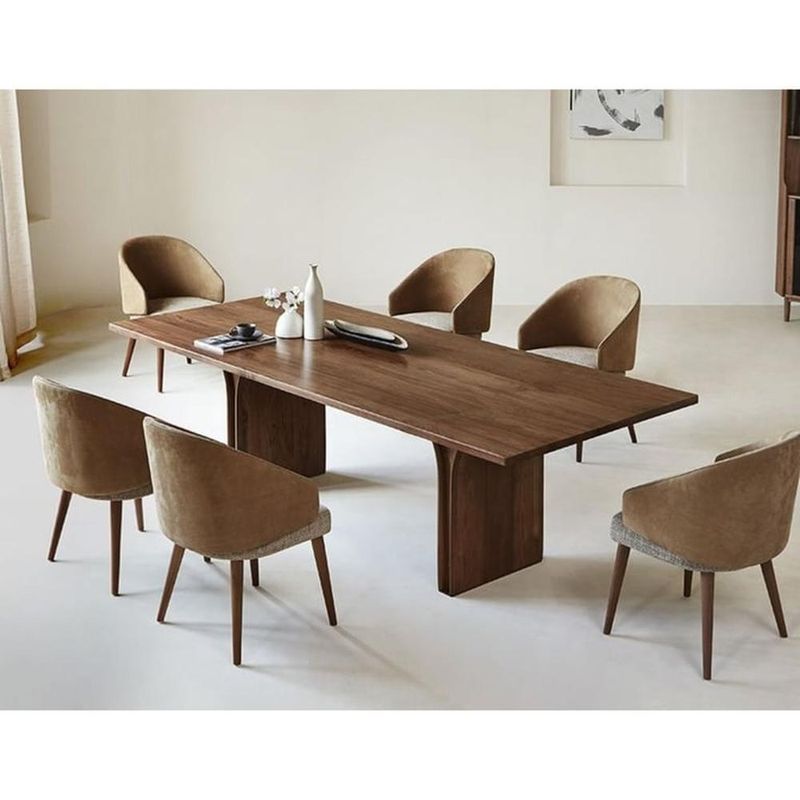 El producto que se muestra es un elegante conjunto de comedor moderno, compuesto por una mesa rectangular de madera y sillas de diseño contemporáneo. La mesa destaca por su estructura robusta y estilizada, con un tablero de madera de acabado natural que realza las vetas y texturas del material, brindando calidez y sofisticación al ambiente. Las patas de la mesa tienen un diseño único con líneas verticales que añaden un toque de dinamismo y modernidad, además de proporcionar un soporte firme y estable.