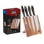 Este juego para asado es ideal para preparar tus mejores asados con estilo y practicidad. Incluye cuchillos para carne, cuchillo para deshuesar, tenedor trinchante y cepo magnético, todos utensilios esenciales para preparar y servir un buen asado.