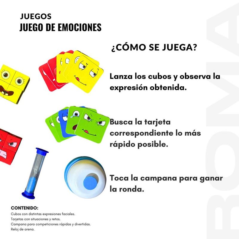 Incluye: Cubos con distintas expresiones faciales, tarjetas con situaciones y retos, y campana para competiciones rápidas y divertidas.