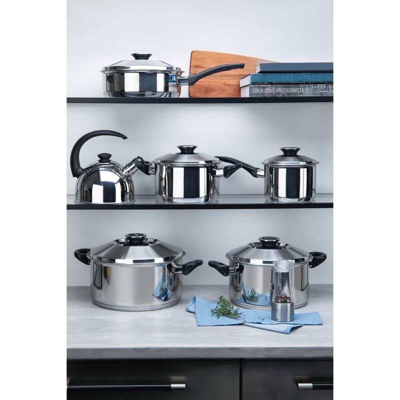 Los amantes de la culinaria lo confirman, además de alimentos sabrosos, una deliciosa comida necesita prepararse en utensilios de calidad. La batería de cocina Real Plaza de acero inoxidable fondo triple con mangos y asas de baquelita 6 piezas conjuga practicidad y seguridad en toda su línea. Totalmente hechas de acero inoxidable, las ollas no sueltan residuos en los alimentos, manteniéndolos sanos. El fondo triple (acero inoxidable + aluminio + acero inoxidable) distribuye el calor uniformemente, lo que proporciona una cocción más rápida. Altamente durables, las ollas mantienen las características originales, preservando la belleza, la higiene y la durabilidad del material. Los mangos y asas poseen protector de llamas y no se calientan, evitando que se quemen cuando la llama no esté centralizada en el fondo de la olla. Las tapas, con encaje perfecto, tienen salida de vapor para que la preparación de su receta sea totalmente segura. La batería se puede utilizar en las cocinas: de gas, eléctrica, vitrocerámica y por inducción y para limpiar, basta colocar las ollas en el lavavajillas. La batería de cocina Real Plaza de acero inoxidable fondo triple con mangos y asas baquelita con terminación brillante es perfecta para quien le gusta la sofisticación y la practicidad en la cocina.