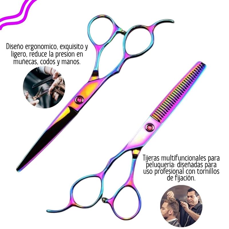 Este set de tijeras es ideal para peluqueros, estilistas o uso personal en el hogar. Su diseño ergonómico y acabado multicolor brindan comodidad y estilo, permitiendo cortes precisos y suaves. Incluye accesorios esenciales para un trabajo completo y profesional.