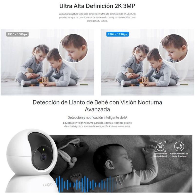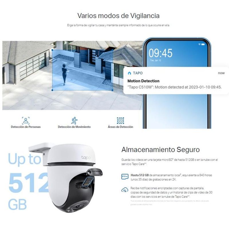 - Almacenamiento seguro: Guarda hasta 512GB de vídeo en una tarjeta microSD o utiliza Tapo Care para almacenamiento en la nube.