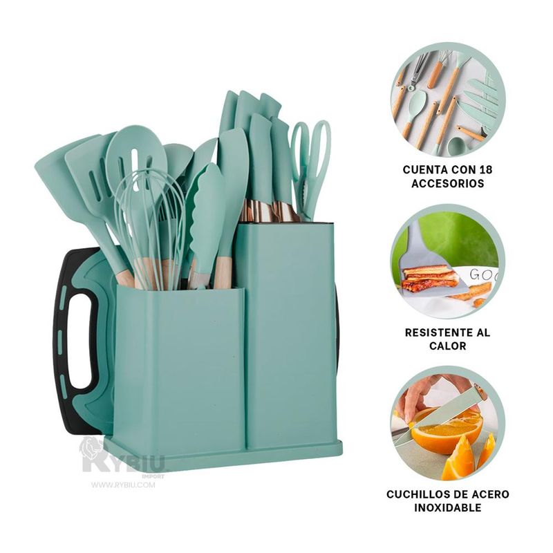Adquiere este maravilloso set de 18 piezas de utensilios de cocina, incluyendo cucharones, cuchillos, tabla de picar y más en color verde, el cual puede ser utilizado por personas que buscan equipar su cocina con herramientas versátiles y funcionales. Para usarlo, simplemente seleccione el utensilio adecuado para la tarea que esté realizando, ya sea cocinar, cortar o picar, y utilice la tabla de picar para preparar sus ingredientes. Puede ser utilizado en cualquier cocina, ya sea en casa, en restaurantes, en campamentos o en eventos al aire libre. Observaciones adicionales: las fotografías y descripción del producto son referenciales. Producto sujeto a stock de colores. Garantía: 7 días por daños de fábrica. El Modelo de los(el) regalo(s) está sujeto a disponibilidad de stock y colores. • Funcional: SÍ • Material: Silicona, madera • Modelo: CO29819 • Codigo: CO29819