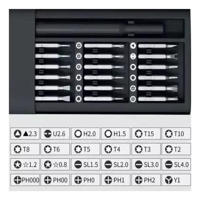 *Componentes incluidos: juego de destornilladores EZ 25 en uno/24 cabezas de broca de precisión magnética de acero * S2: PH1, 0, 000, 00; SL2, 1,5; T8H; T10H; T5H; T6H; t9H; H2, 0,7, 0,9, 1,5; T2, 3, 4; P2, 5; W1.5; Y0.6, 1; 2,3