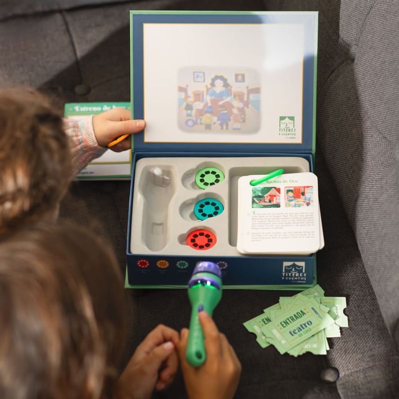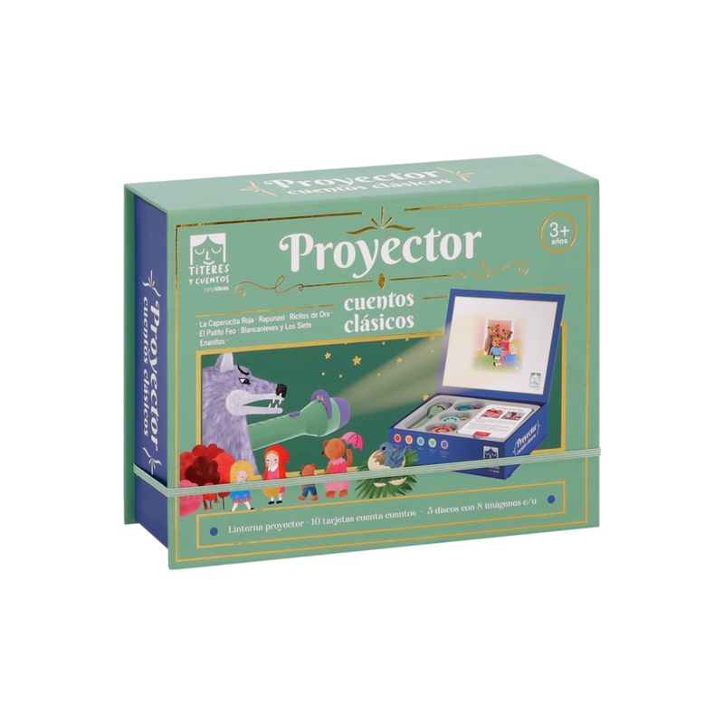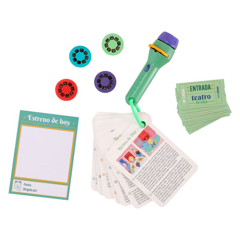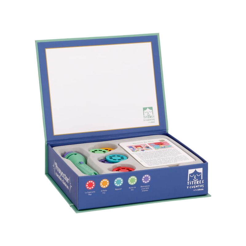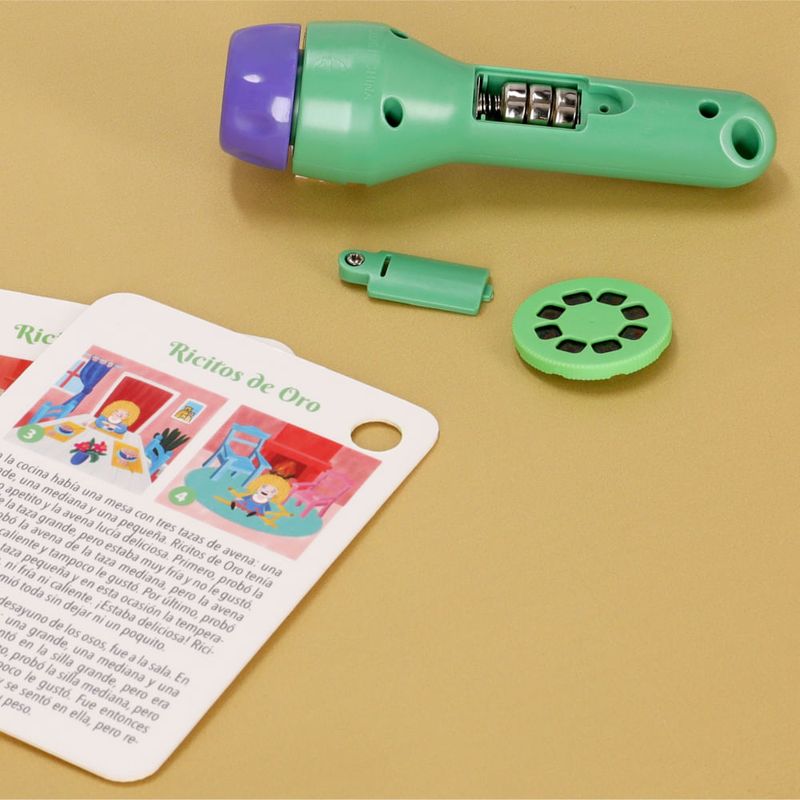 - Incluye: Linterna proyector, 10 tarjetas cuenta cuentos, 5 discos con 8 imágenes c/u.