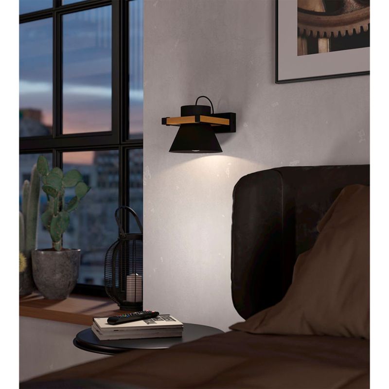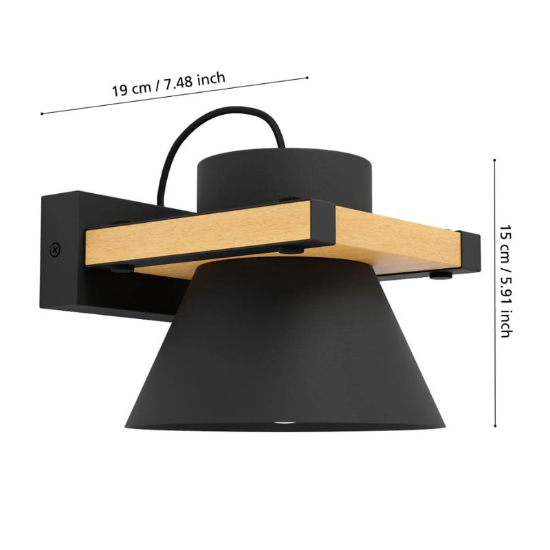 La lámpara de pared MACCLES está hecha de metal en negro, que se integró en una placa de madera. El soporte de pared hecho de metal negro y los clips de madera a juego subrayan el aspecto industrial de la lámpara. La lámpara de pared en un diseño especial se adapta perfectamente a los estilos de muebles modernos. Gracias a la moderna mezcla de madera y metal, ofrece un toque de distinción para sus sala de estar. La bombilla de filamento que se muestra no está incluida. La lámpara es adecuada para bombillas con casquillo E27.