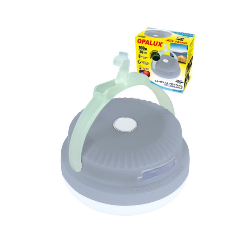 Lámpara portátil recargable Opalux OP-FD100W de 100 W con batería interna de 2400 mAh. Cuenta con modos de luz Alta, Media y Baja, ajustable para diferentes necesidades (camping, iluminación de emergencia, exteriores). Proporciona iluminación eficiente, ángulo de luz amplio de 180°, y se recarga vía USB en aproximadamente 6 horas. Compacta y práctica para uso doméstico o al aire libre.