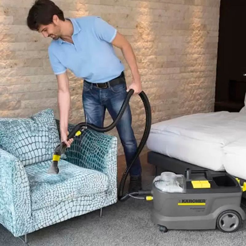 La lava-aspiradora Puzzi 10/1 realiza una limpieza profunda o de mantenimiento de superficies alfombradas de tamaño pequeño a mediano, así como de tapicerías.