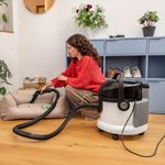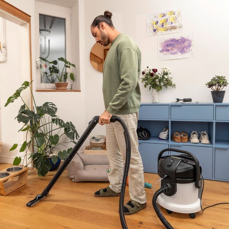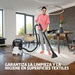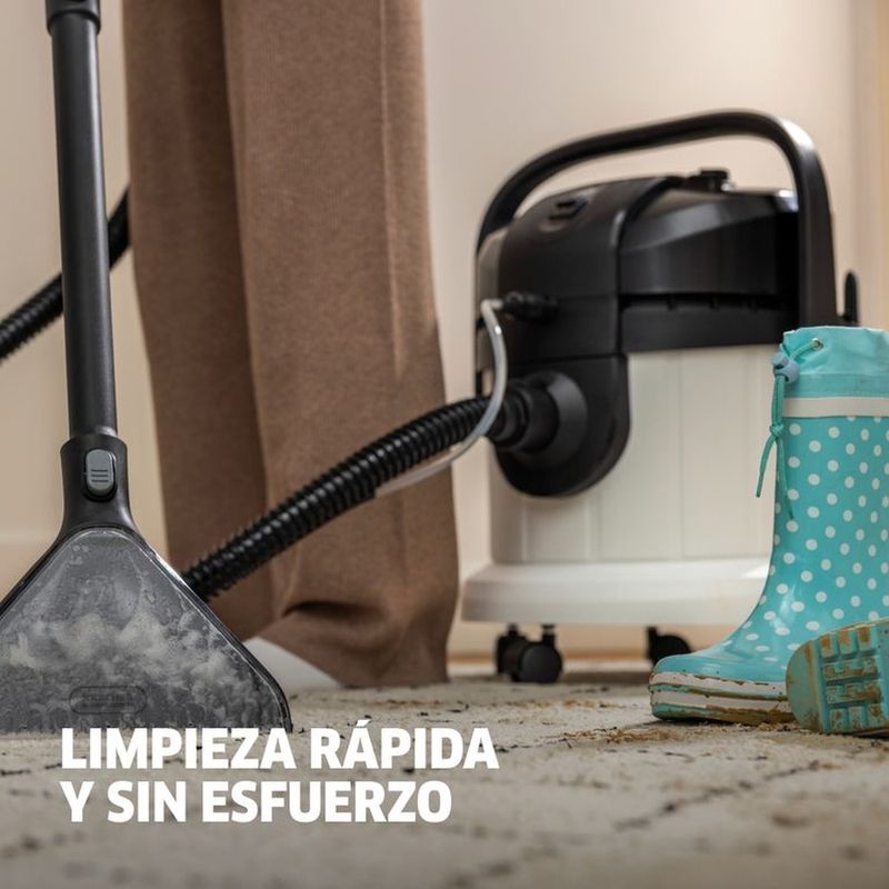Limpieza en profundidad, comodidad ergonómica y versatilidad: la lava-aspiradora SE 4, con su atractivo diseño de trineo, garantiza la limpieza a fondo y la higiene en muchas superficies textiles. La probada tecnología de extracción mediante pulverización de Kärcher ofrece los mejores resultados de limpieza: el agua limpia del grifo y el detergente para alfombras RM 519 de Kärcher se pulverizan a presión en las superficies textiles y se aspiran de nuevo junto con la suciedad desprendida. Ideal para familias, personas alérgicas y hogares con mascotas. Como producto multifuncional 3 en 1, el equipo también puede utilizarse como aspiradora en seco y húmedo totalmente funcional. El gran depósito de agua limpia extraíble de 4 l es resistente a los golpes y translúcido, por lo que facilita el llenado y el vaciado. El agua sucia aspirada se recoge en el depósito del equipo. La empuñadura de puente 3 en 1 permite transportar, abrir, cerrar y vaciar el depósito con gran comodidad. Los accesorios suministrados pueden guardarse fácilmente en el equipo, que es fácil de limpiar después de su uso, para lograr una vida útil más prolongada del producto.