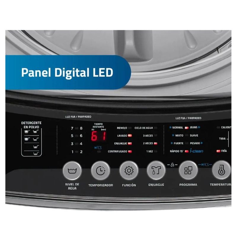 Equipada con 8 programas automáticos, control de temperatura con 3 niveles, 8 niveles de agua y tecnología antienredo, esta lavadora optimiza cada ciclo para proteger las prendas y ahorrar recursos. Su diseño moderno en color gris oscuro, el panel digital y la eficiencia energética A la convierten en una de las mejores opciones del mercado.