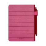 Libreta para composición que incluye elástico y bolígrafo con tinta negra.