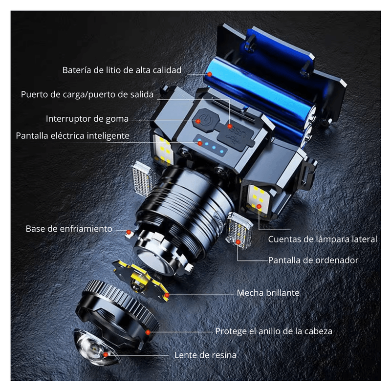 Diseñada para brindarte la iluminación que necesitas en cualquier situación, esta linterna frontal combina potencia, comodidad y durabilidad en un paquete compacto y ligero.