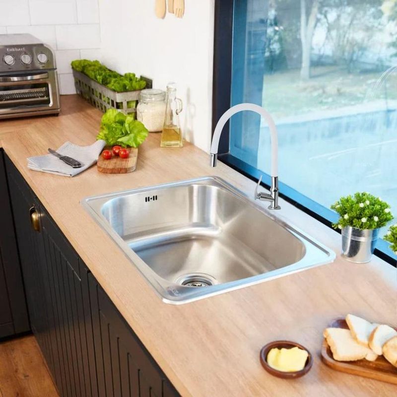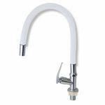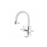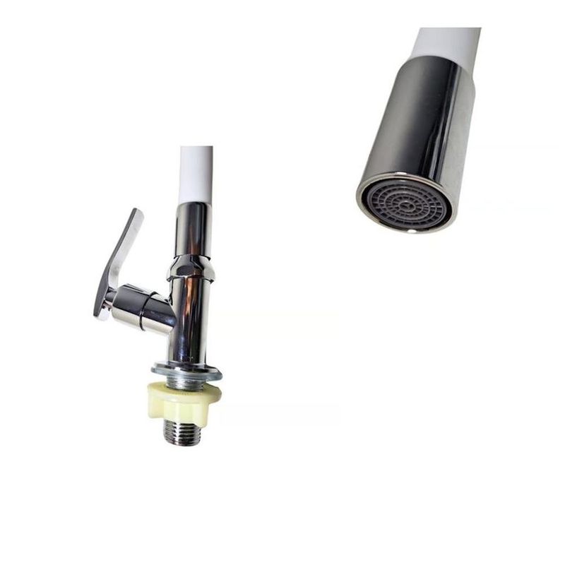 Características; Llave para Lavadero a la Pared, Pico ganso con cuello flexible revestido de poliuretano resistente al desgaste prematuro y alta fricción, cabeza de Acero Cromado reforzada y cuerpo de Acero Inoxidable, Cabeza tipo difusor tamaño chico.