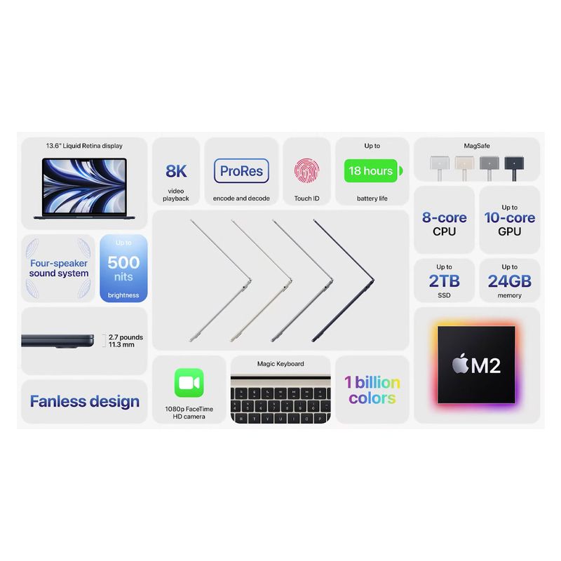 Rediseñada en torno al chip M2 de próxima generación, la MacBook Air es sorprendentemente delgada y brinda una velocidad y eficiencia energética excepcionales dentro de su resistente carcasa de aluminio. Es la computadora portátil ultrarrápida y ultracapaz que le permite trabajar, jugar o crear casi cualquier cosa, en cualquier lugar. Hay poder en el silencio. Gracias a la eficiencia del chip M2, la MacBook Air puede ofrecer un rendimiento increíble sin ventilador, por lo que permanece completamente en silencio sin importar cuán intensa sea la tarea. El chip M2 inicia la próxima generación de silicio de Apple, con aún más de la velocidad y la eficiencia energética de M1. Para que pueda hacer más cosas más rápido con una CPU de 8 núcleos más potente. Cree imágenes y animaciones cautivadoras con una GPU de hasta 10 núcleos. Trabaje con más transmisiones de video 4K y 8K ProRes con el motor multimedia de alto rendimiento. Y siga trabajando, o jugando, todo el día y hasta la noche con hasta 18 horas de duración de la batería. Con teclado mágico retroiluminado en inglés.