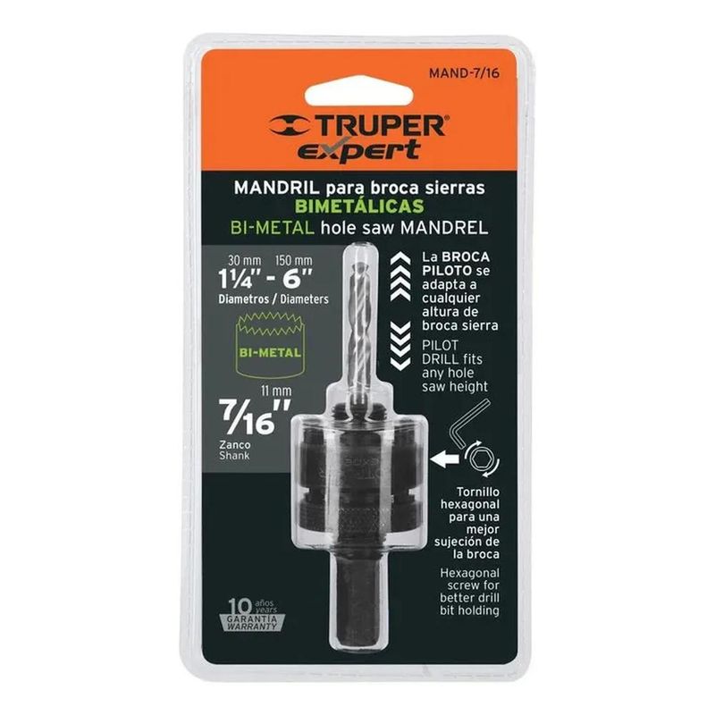 Mandril zanco 7/16" para brocasierras bimetálicas, Expert Broca piloto ajustable a cualquier altura de brocasierra • Tornillo hexagonal para una mejor sujeción de la broca Especificaciones Broca piloto 1/4" Zanco 7/16" Diámetros 1 1/4" - 6" Empaque individual Blíster Inner 6 Master 36 CÓDIGO: 18123