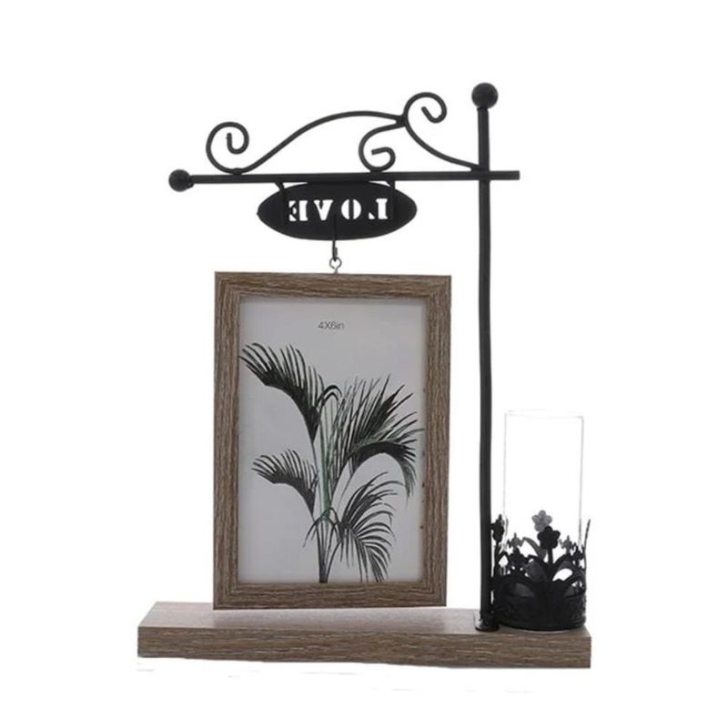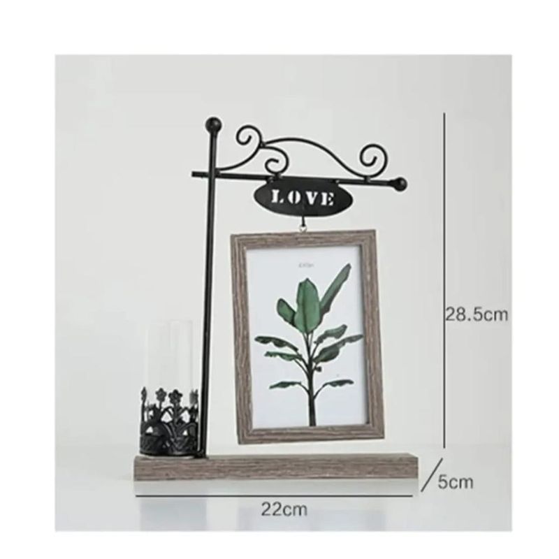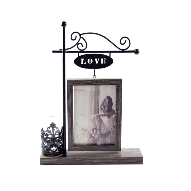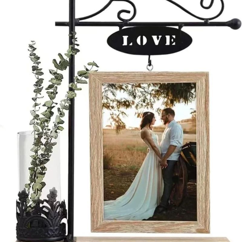 • Diseño Único: Cuenta con un elegante soporte de metal estilo farol con un letrero de "LOVE" que cuelga sobre el marco.