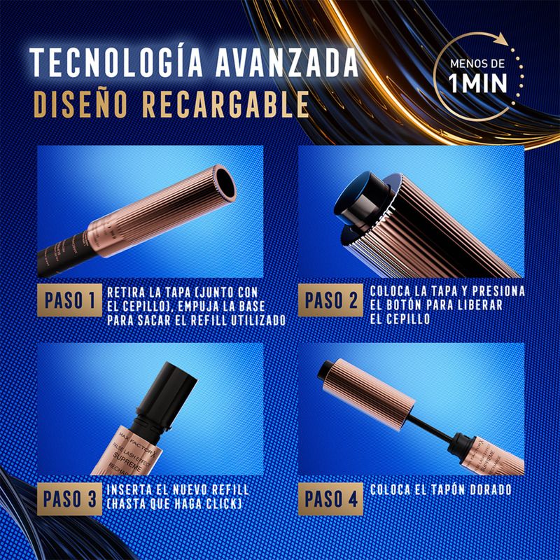 Nuestra primera máscara de pestañas recargable, Max Factor False Lash Effect Supreme Recharge. Cuenta con un cepillo modelador de pestañas con cerdas únicas que cubren cada pestaña de principio a fin para un efecto instantáneo de pestañas postizas, full impacto y volumen total. Su fórmula infusionada con sérum de Keratina brinda un tratamiento prolongado para las pestañas, fortaleciéndolas semana a semana. *7X volumen instántaneo. *Diseño recargable de alta tecnología para un uso infinito, recambio en 1 solo minuto... ¡Recarga, rellena, repite!