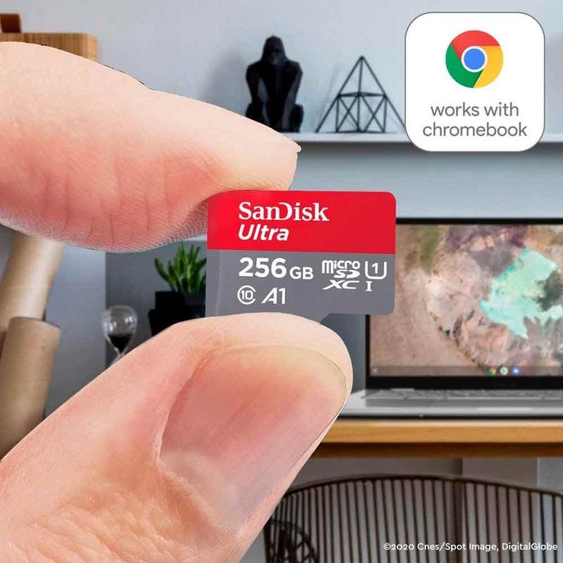 Ya sea para la escuela, el trabajo o el juego, la tarjeta SanDisk Ultra microSD UHS-I te brinda la libertad de almacenar y acceder a tus fotos, videos, archivos y más. Está probado y certificado para funcionar a la perfección con Chromebooks, lo que le brinda tranquilidad desde el principio. Con capacidades de hasta 256 GB*, tendrá espacio para horas de video Full HD(2) y velocidades de transferencia de hasta 150 MB/s** lo ayudarán a mover su contenido rápidamente, directamente desde la tarjeta (Full HD (1920 x 1080) el soporte de video puede variar en función del dispositivo host, los atributos de archivo y otros factores. Ver sitio web oficial de SanDisk.)(hasta 150 MB/s de velocidad de lectura, diseñada con tecnología patentada para alcanzar velocidades más allá de UHS-I 104 MB/s, requiere dispositivos