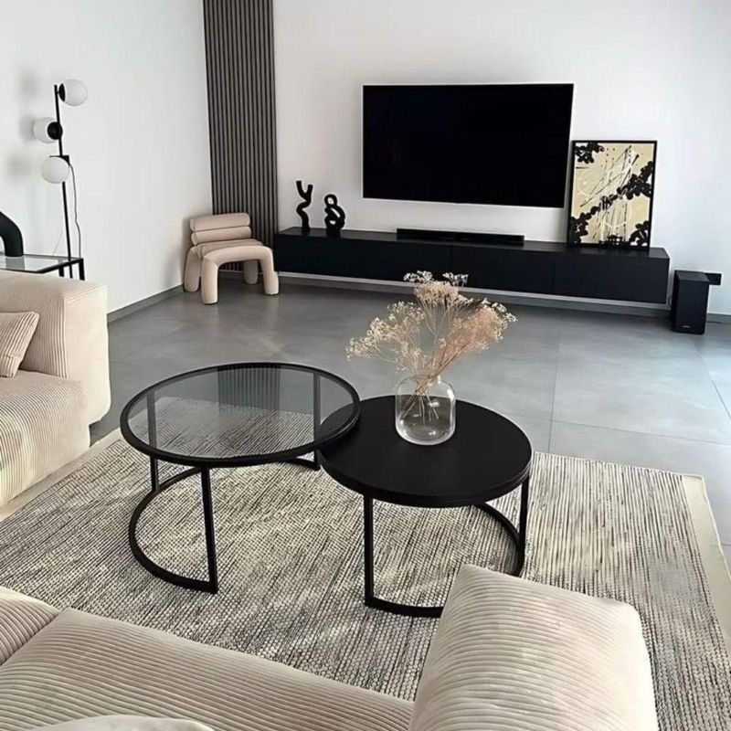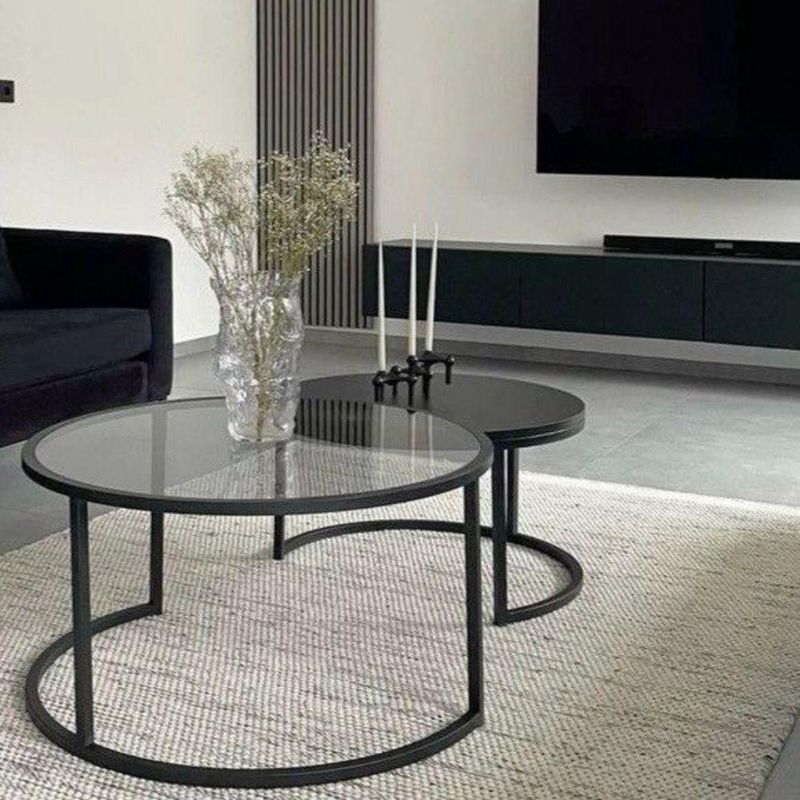 |Materiales de Tablero: Vidrio Interno Transparente y Melamina Pelikano Color: Negro-Soportes : Metal Pintado al Horno en Negro Mate con Doble Capa Zincromato-Material de Soporte: Tubo Cuadrado de 5/8"-Contiene 2 Pieza -Medida: 60/50 cm de Diámetro x 40/35 cm de alto|