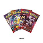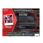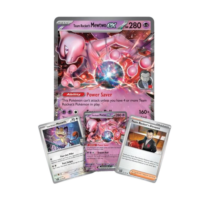 En su búsqueda del poder absoluto y la dominación mundial, ¡Giovanni y el Equipo Rocket desatan la estremecedora fuerza de un temible Pokémon en combate! Cuando Mewtwo ex del Equipo Rocket es respaldado por otros Pokémon del Equipo Rocket, su ataque Bola Aniquiladora puede infligir hasta 280 puntos de daño de un solo golpe. En esta caja encontrarás a este poderoso Pokémon ex como carta promo holográfica junto a Meowth del Equipo Rocket y a Giovanni del Equipo Rocket, además de 1 fotocalcomanía y un montón de sobres de refuerzo. La Caja Mewtwo ex del Equipo Rocket de JCC Pokémon contiene: • 1 carta promo holográfica de Mewtwo ex del Equipo Rocket • 2 cartas holográficas: Meowth del Equipo Rocket y Giovanni del Equipo Rocket • 1 carta holográfica jumbo de Mewtwo ex del Equipo Rocket • 1 fotocalcomanía • 4 sobres de refuerzo de JCC Pokémon • 1 carta con código para JCC Pokémon Live