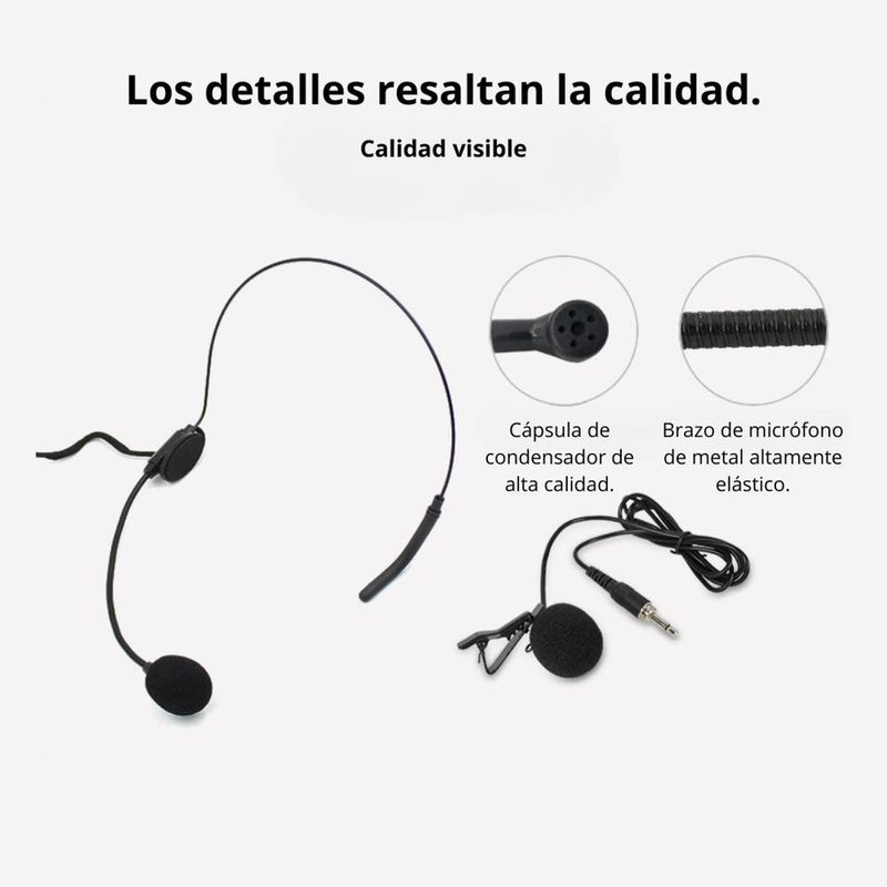 Habla, canta o dirige con total libertad gracias a este micrófono inalámbrico doble VHF. Incluye diadema y clip de solapa, pantalla LED y alcance de hasta 100 metros. perfecto para conferencias, clases, iglesias, fitness o presentaciones.