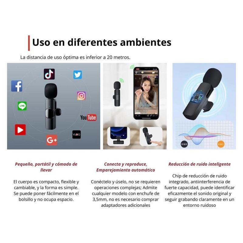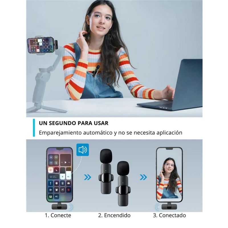 Micrófono Inalámbrico, de solapa Recargable, ideal para grabar audios y trasmitir para YouTube, Facebook Live, Stream, Vlog. etc