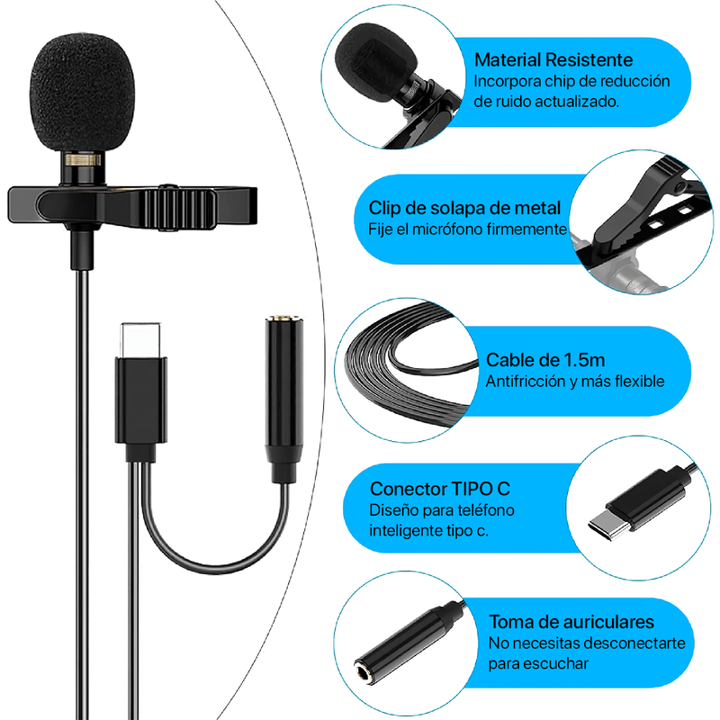 • Producto 100% garantizado - Micrófono Lavalier Solapero Tipo C Supervisión De Audio Celular Laptop -