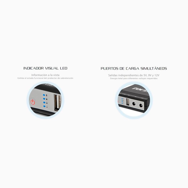 Esta UPS portátil es una fuente de alimentación ininterrumpible diseñada para mantener la red y la internet funcionando en el evento de un corte eléctrico, al mismo tiempo que brinda protección a todas las cargas conectadas Ideal para : Módems y routers, Cámaras de seguridad, Tablets y teléfonos, Sistemas de Alarma , biométricos, Luces de emergencia y Electrónicos portátiles Capacidad: 14W Voltaje: 110v / 220v Corriente: 1A Salidas simultáneas: 5/9/12VCC Tipo de entrada: Conector de CC, de 5,5x2,1mm Tipo de salida: Conjuntor de 5,5x2,5mm para 12VCC, Conjuntor de 5,5x2,5mm para 9VCC, 1 puerto USB para 5VCC Batería: Célula de litio de dos piezas Indicador visual: LED de encendido, de carga y de conexión de entrada Protección contra sobrecargas, sobretensión, descarga y cortocircuito Cubierta: Plástico retardador de llama Color: Negro Incluye Boleta o factura