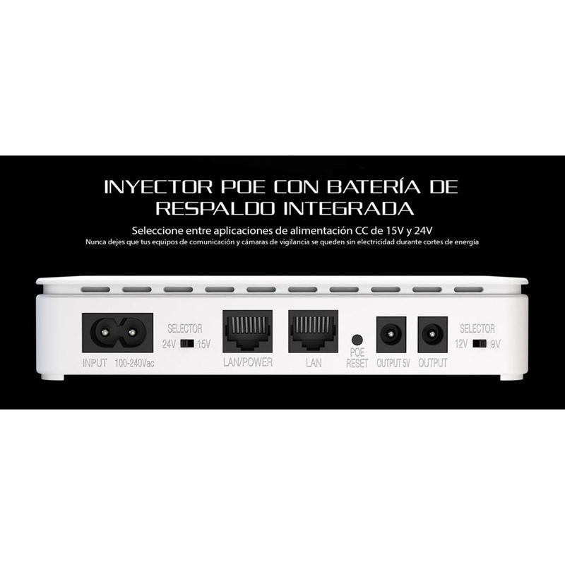 - Banco de energía de CC integrado con salidas PoE Gigabit, USB y CC