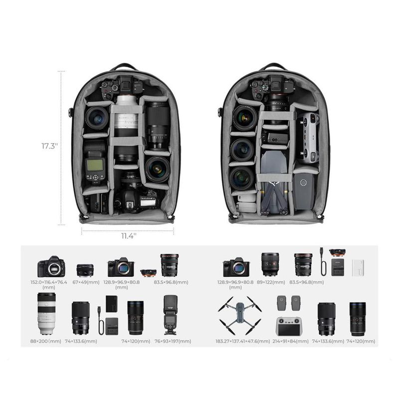 Tiene capacidad para 2 cámaras + varios lentes + computadora portátil + trípode para cámara + accesorios.