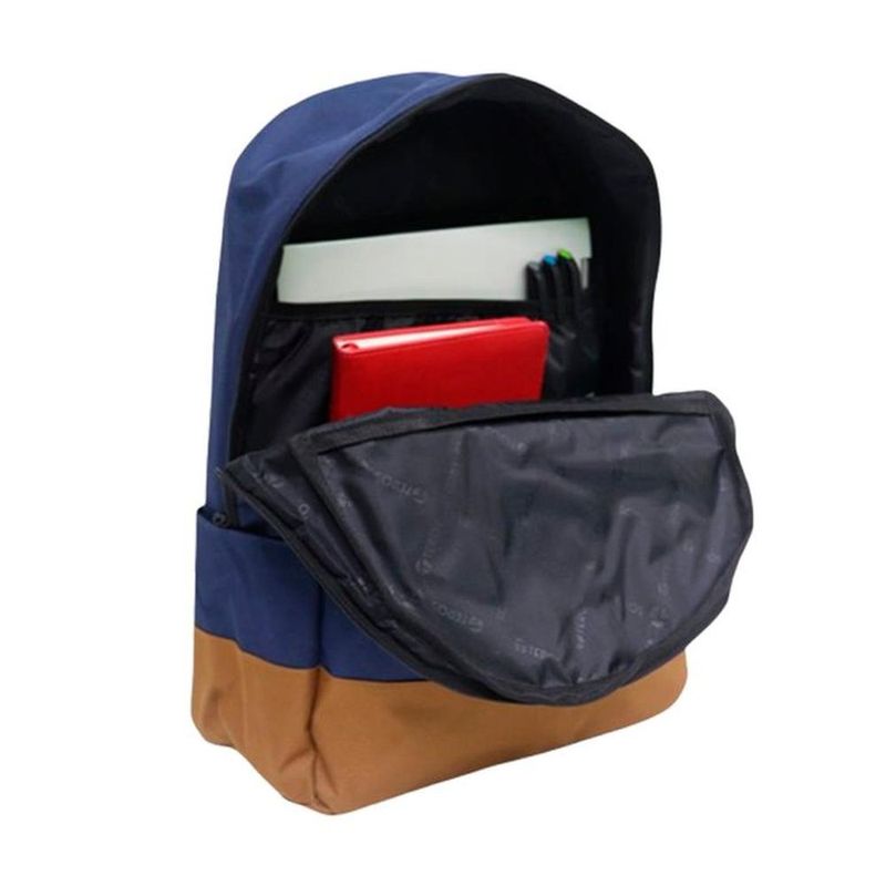 Mochila Teros TE-ACS9019BL azul + marrón con 1 compartimento principal con cierre, 1 bolsillo frontal con cierre y dos bolsillos laterales. El compartimento principal incluye un bolsillo acolchado para portátil hasta 15.6" y un bolsillo interior con cierre velcro.