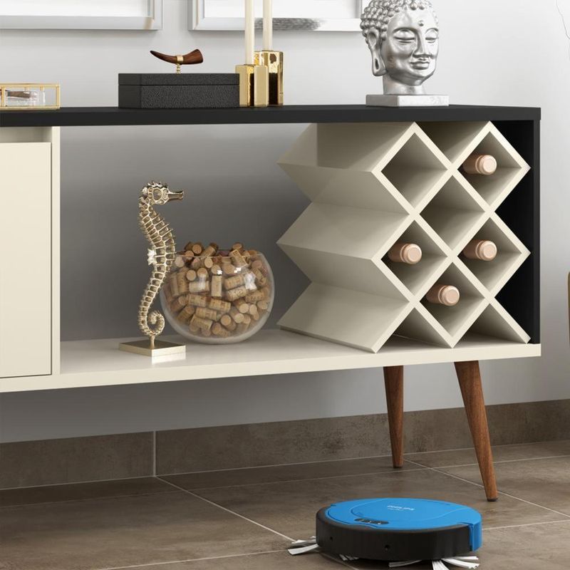 •Cuenta con un gabinete con puerta, estantes abiertos y un compartimento específico para botellas de vino. Esto lo convierte en un mueble funcional para organizar y exhibir objetos.