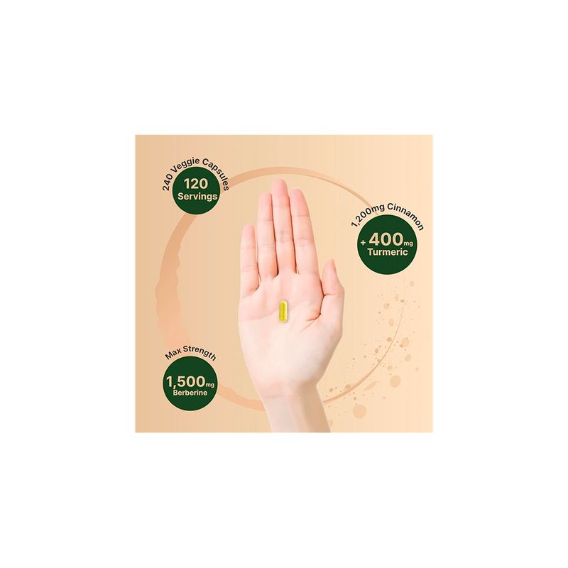 Cápsulas vegetarianas de berberina 2 en 1 de alta pureza con canela auténtica de Ceilán, extractos concentrados 10:1 de origen puro de raíz y corteza.|240 cápsulas vegetarianas por botella, tamaño de porción de 2 cápsulas, 1500 mg de berberina HCl 10:1 de raíz de Berberis Aristata y 10:1 de canela de Ceilán 1200 mg de corteza de canela verum por dosis.|Una potente fórmula para la salud y el bienestar que combina propiedades activas a base de hierbas y plantas para reforzar la salud general de la glucosa y el azúcar y promover la salud inmunológica, antienvejecimiento y longevidad.|La combinación de berberina y canela crea un efecto sinérgico que amplifica sus beneficios individuales. Los alcaloides de la berberina pueden ayudar a mejorar los nutrientes polifenoles de la canela, lo que aumenta la actividad antioxidante y la biodisponibilidad.