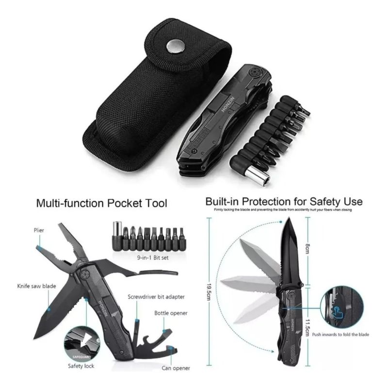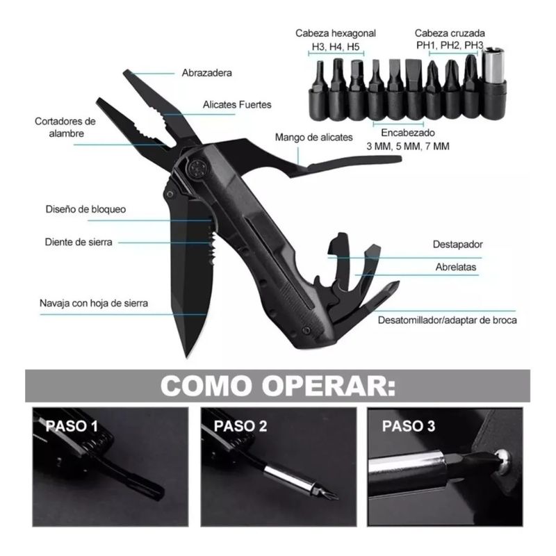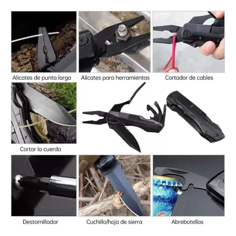 Multifuncional 13 en 1: Incluye cuchilla, alicates, cortadores de alambre, destornilladores y más.