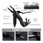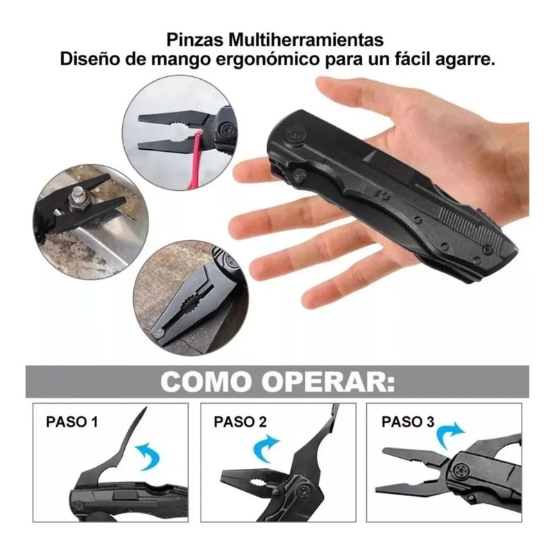 Herramientas desplegables: Cuchillo, abridor de latas, abridor de botellas, alicates y extensor para puntas.