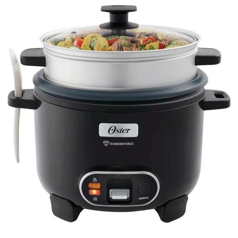 La olla arrocera Oster CKSTRC10DFBLK-053 ofrece un diseño moderno en color negro y funcionalidad versátil para tus comidas diarias. Con capacidad para preparar hasta 10 tazas de arroz cocido, es perfecto para familias que disfrutan de recetas caseras y balanceadas.