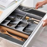 ¡Un organizador de cubiertos no con 5 ni 6 compartimentos, sino con hasta 12 ! Diseño expandible y moderno con 12 compartimentos de distintos tamaños y profundidades para guardar y mantener en orden tus cubiertos, utensilios y demás accesorios de cocina. Sus lados se expanden de 28 a 51 cm para adaptarse a diferentes cajones. Puedes usarlo también para guardar otros objetos como anillos, collares, relojes, etc. Material: plástico resistente. Medidas: 39 x 28 a 51 (expandible) x 5.5 cm