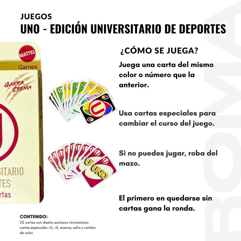 Incluye: 112 cartas con diseño de U. Cartas especiales: +2, +4, reversa, salto y cambio de color.
