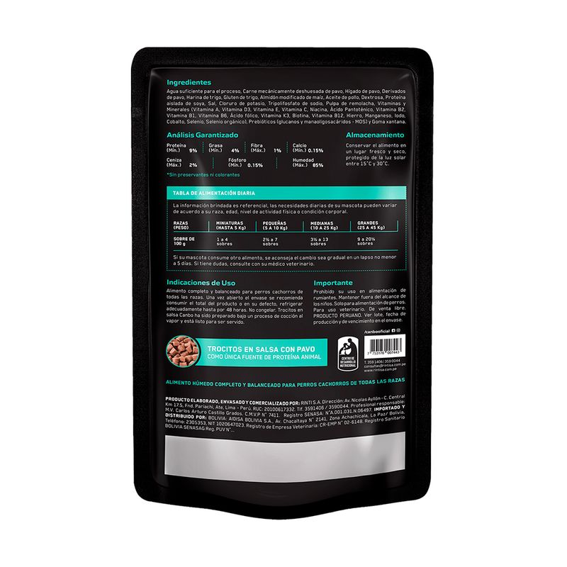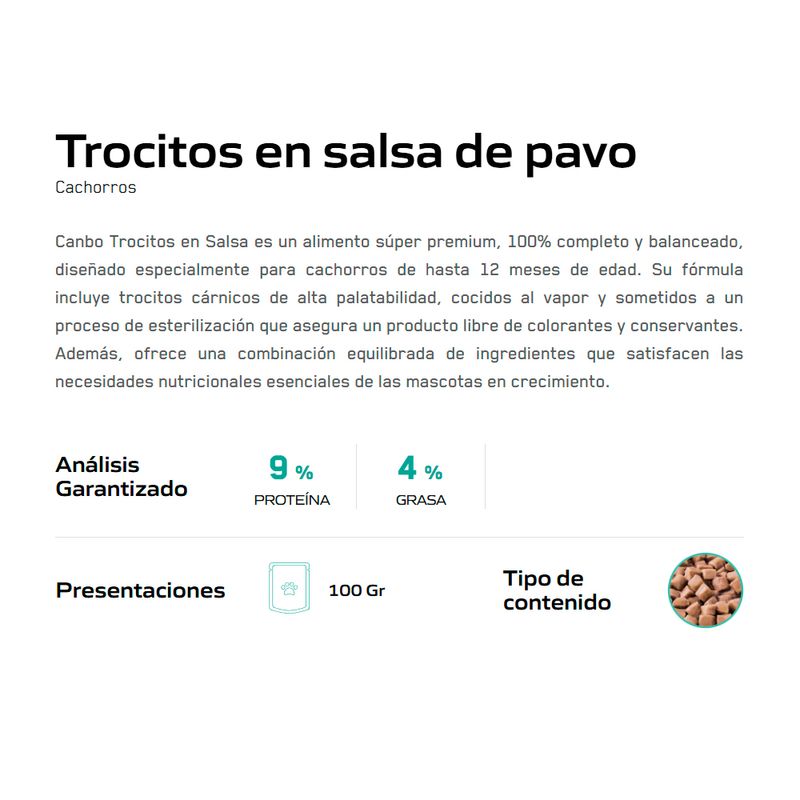 Canbo Trocitos en Salsa es un alimento súper premium, 100% completo y balanceado, diseñado especialmente para cachorros de hasta 12 meses de edad. Su fórmula incluye trocitos cárnicos de alta palatabilidad, cocidos al vapor y sometidos a un proceso de esterilización que asegura un producto libre de colorantes y conservantes. Además, ofrece una combinación equilibrada de ingredientes que satisfacen las necesidades nutricionales esenciales de las mascotas en crecimiento.