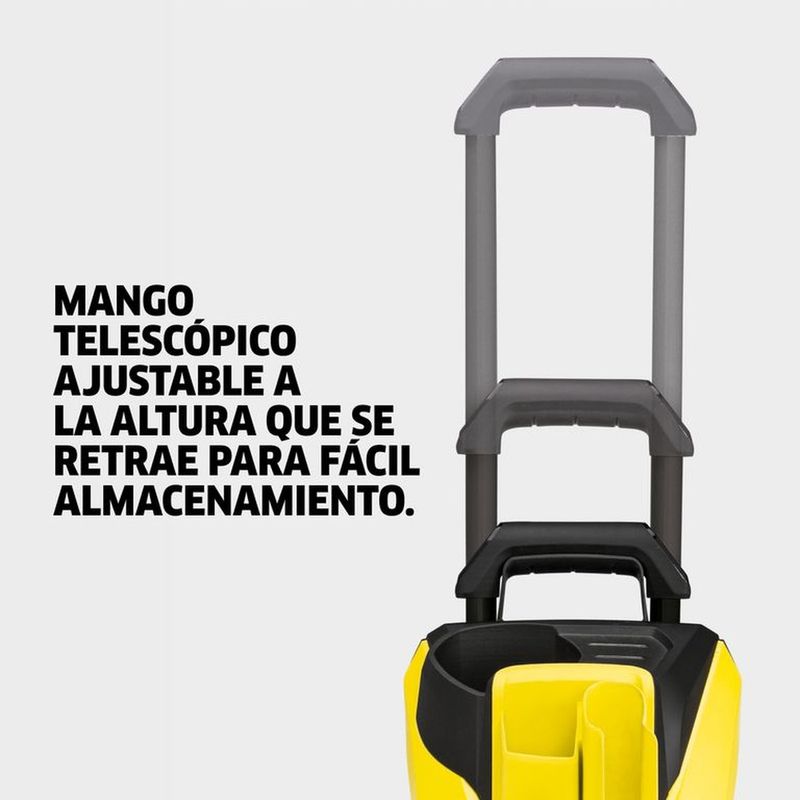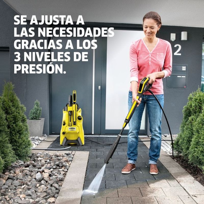 La hidrolavadora K 4 Power Control Home es la solución inteligente para limpieza doméstica en vehículos, fachadas, terrazas, muebles de jardín, entre otros. Equipada con un motor de inducción refrigerado por agua de alto rendimiento, ofrece hasta 130 bar de presión y 420 l/h, ideal para tareas exigentes sin comprometer eficiencia ni silencio. Su pistola Power Control G 160 Q con display LED muestra el modo seleccionado, mientras que la lanza Vario Power permite ajustar al tipo de superficie girándola suavemente. El sistema Plug ’n Clean permite cambiar detergente fácilmente, sin derrames. Entre sus facilidades, destacan el asa telescópica retráctil, el sistema Quick Connect para manguera y lanza, y su soporte para almacenar accesorios.