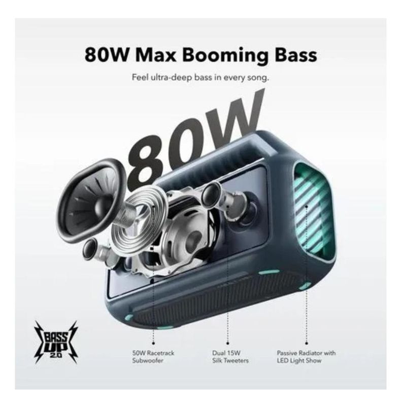 Disfruta de graves profundos y potentes con hasta 80 W de salida máxima gracias a su subwoofer de alta carrera y tecnología BassUp™ 2.0, que realza cada ritmo y detalle. Su sistema estéreo 2.1 combina un subwoofer de 50 W con tweeters de 15 W para ofrecer una claridad y balance excepcionales. Con hasta 24 horas de reproducción continua, el Boom 2 es el compañero perfecto para cualquier aventura, resistente al agua con certificación IPX7 y flotante para que lo lleves a playas, piscinas o excursiones sin preocupaciones. Además, incluye cargador integrado para mantener tu teléfono activo dondequiera que estés. Personaliza tu experiencia sonora con su ecualizador profesional y conecta más de 100 altavoces con PartyCast 2.0 para crear el ambiente perfecto y la mejor fiesta