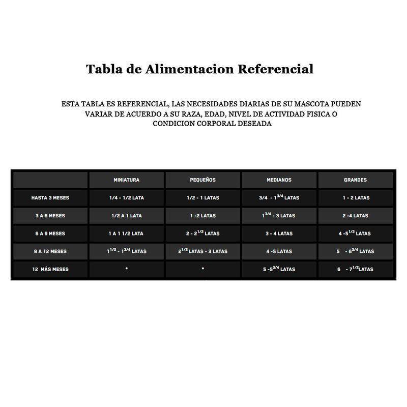 Carne de pollo y/o derivados de pollo, Hígado de pollo y/o porcino, Agua suficiente para el proceso, Carne de bovino, Vísceras de bovino y/o cerdo, Arroz, Goma guar, Cloruro de potasio, Lignocelulosa, Sal, Linaza, Aceite de pescado, Plasma porcino, Prebióticos (Betaglucanos y mananoligosacáridos- MOS), Vitaminas (Vitamina A, Vitamina D3, Vitamina E, Vitamina C, Niacina, Ácido pantoténico, Vitamina B2, Vitamina B1, Vitamina B6, Ácido fólico, Vitamina K3, Biotina, Vitamina B12), Minerales (Hierro, Manganeso, Yodo, Cobalto, Selenio, Selenio) y Extracto de Yucca schidigera.