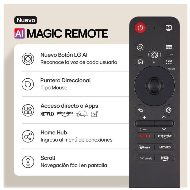 • Funciones: HDR10 Pro, AI Picture Wizard, AI Sound Pro, AI Chatbot, AI Concierge, Voice ID, Home Hub, actualizaciones webOS por 5 años