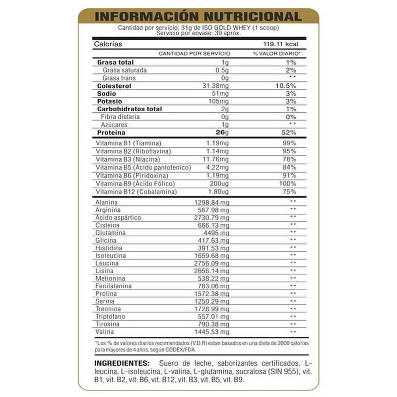 ISO GOLD WHEY es la proteína de suero más pura del mercado. da 26 gramos conformado 100% de proteína de suero aislado + aminoácidos BCAA incluyendo L-leucina, sin gluten.