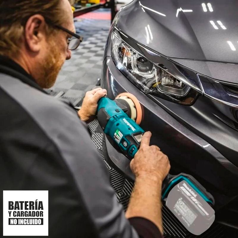 El modo de acabado es acción orbital con rotación libre de la almohadilla para un pulido fino; permite 30 min. funcionamiento con batería de iones de litio de 18V 6.0 Ah.