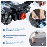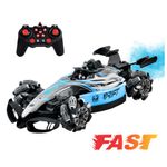 Carro de carreras azul para niños con control remoto, luces LED, música y espectacular efecto de humo. Incluye dos controles: uno tradicional y otro con sensor de mano para mayor diversión. Ideal para regalos y horas de entretenimiento. Funciona con baterías (no incluidas). ¡Velocidad, sonido y acción en un solo juguete innovador!