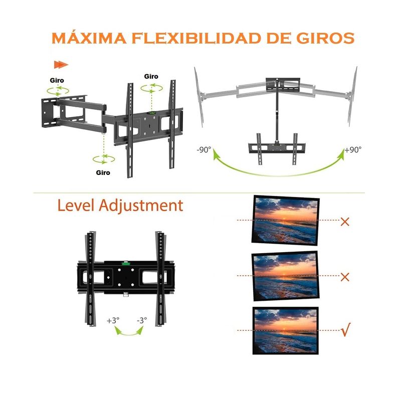 Producto 100 % de fábrica, No artesanal, Soporte móvil plegable de 3 giros LED/SMART 32" - 65", Compatible con formatos VESA desde 200x100mm hasta 400x400mm, Movimientos de giro, plegado, inclinación y nivelación, Permite extender la pantalla hasta 75 cms(GIROS REALES DE 90 GRADOS CON RESPECTO A LA PARED), Distancia mínima a pared: 8 cms, Incluye manual y accesorios de instalación(burbuja de nivel, tarugos, tirafones, 1 llave ALLEN, 4 pernos M4X20mm, 4 pernos M6X20mm, 4 pernos M8X25mm), El precio NO incluye el servicio de instalación, Se emite BOLETA O FACTURA.