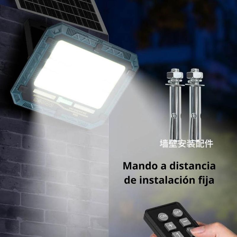 Ilumina tus espacios exteriores con este proyector solar de alta potencia, perfecto para emergencias, seguridad o iluminación ambiental. Con control remoto, temporizador y triple color de luz, es versátil, recargable y preparado para cualquier clima.
