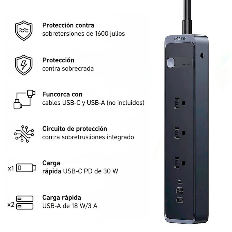 La regleta UGREEN S731 (modelo 25353) es la solución perfecta para quienes buscan un dispositivo multifuncional, seguro y eficiente para alimentar y cargar varios dispositivos al mismo tiempo. Con un diseño moderno y compacto, esta regleta incorpora 3 tomas de corriente, 2 puertos USB-A y 1 puerto USB-C, ofreciendo una experiencia de uso completa para hogares, oficinas o estaciones de trabajo tecnológicas.