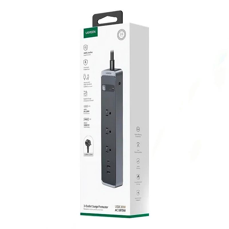 El protector contra sobretensiones de 30 W de UGREEN ofrece a los usuarios tres tomacorrientes NEMA 5-15R, un puerto USB-C y dos puertos USB-A, todos para cargar y alimentar dispositivos. El puerto USB-C carga dispositivos hasta 30 W, mientras que los puertos USB-A funcionan hasta 18 W. También incluye 1600 julios de protección contra sobretensiones, protección contra sobrecargas, tecnología GaN y Thermal Guard, USB Power Delivery 3.0, QC 4.0+ y más. La conexión a una toma de corriente se realiza mediante un enchufe NEMA 5-15P integrado de 17,8 cm.